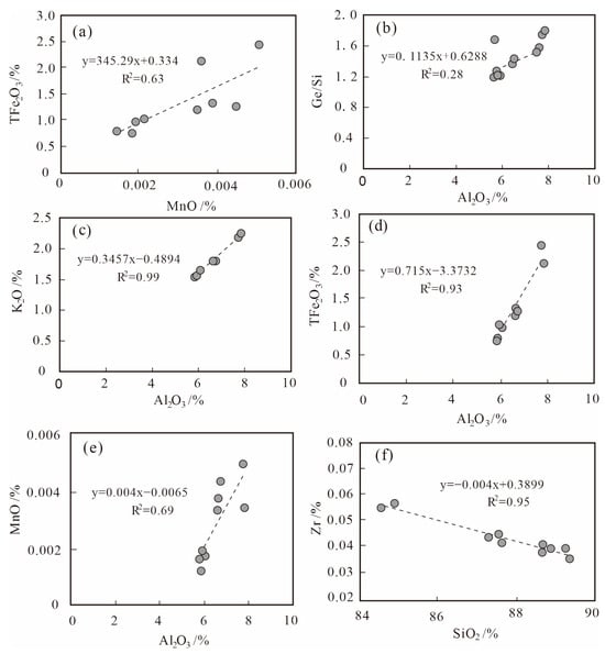 Scatter plots of geochemical data for siliceous components of siliceous-cemented dolomite from the top of the Liangjiashan Formation. (a) Correlation diagram between K2O and Al2O3, showing a significant positive correlation; (b) Correlation diagram between Ge/Si and Al2O3, indicating a positive correlation; (c) Correlation diagram between TFe2O3 and Al2O3, displaying a significant positive correlation; (d) Correlation diagram between MnO and Al2O3, exhibiting a significant positive correlation; (e) Correlation diagram between TFe2O3 and MnO, demonstrating a significant positive correlation; (f) Correlation diagram between Zr and SiO2, revealing a significant negative correlation.