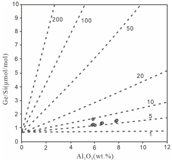 In this study, the primary elemental composition of the siliceous-cemented dolomite is derived from a mixture of four components, including silica, dolomite, clay minerals, and metal oxides. The preprocessing steps effectively removed the carbonate components, thereby excluding the influence of dolomite on the Ge/Si ratio. However, given that clay minerals and metal oxides have higher Ge/Si ratios and cannot be distinguished from the siliceous component during measurement, it is necessary to evaluate the effect of the clay minerals’ Ge/Si ratios before determining the source of the silica. In the siliceous-cemented dolomite from the top of the Liangjiashan Formation, a positive correlation is observed between the Ge/Si ratio and Al2O3 content (Figure 7b), indicating the effect of clay minerals. Additionally, K2O, TFe2O3, MnO, and Al2O3 show strong positive correlations (Figure 7c–e) and significant intercorrelations with each other, implying that apart from the terrestrial silica input, there was also an influx of iron and manganese oxides. However, the total mass of the silica and clay components ranges from 95.53 wt% to 97.65 wt% (avg. 96.90 wt%), with negligible metal oxide concentrations (Table 3); therefore, the influence of the metal oxide on the Ge/Si ratio can be ignored. By using a mass balance model, the Ge/Si ratio of the siliceous component can be estimated by regressing the Al2O3 content to zero. According to this method, the calculated Ge/Si ratio of the siliceous component is determined to be 0.63, which is similar to the Ge/Si ratio of modern seawater (~0.72) [36,37,38]. Thus, the contribution of the hydrothermal-derived silica can be excluded.