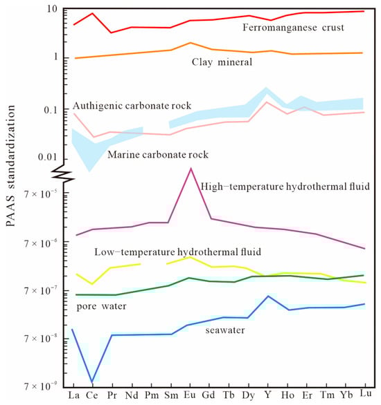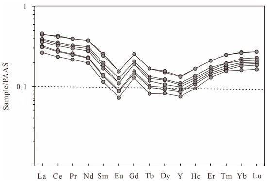 The rare earth elements (REEs) were normalized using the Australian Archaean Shale (PAAS) standard (Table 4) [26,27]. The ΣREEs in the siliceous components of the siliceous-cemented dolomite range from 44.32 μg/g to 80.34 μg/g, with an REEs partition pattern characterized by enriched LREEs and a relatively high LaN/YbN ratio (avg. 1.7, n = 10). The REEs partition patterns of all the samples present a negative Eu anomaly (EuN/Eu*N average value of 0.6), with no Ce anomaly (CeN/Ce*N average value of 0.99, n = 10) (Table 4).