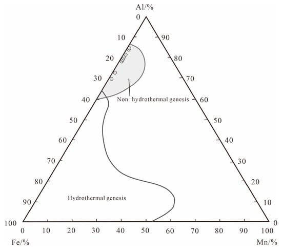 In addition to the Ge/Si ratio, rare earth elements (REEs) can also serve as important indicators for determining the source of silica [42,43]. Murray et al. highlighted that Ce/Ce* (0.5LaN + 0.5PrN) can be used to indicate the source of silica, with marine-derived silica typically exhibiting negative Ce anomalies and an average Ce/Ce* value of 0.29 [44]. In this study, the average Ce/Ce* value for the silica component is 0.99 (Table 4), indicating that the silica did not directly originate from seawater. Additionally, the distribution patterns of the rare earth elements exhibit a noteworthy negative anomaly in Eu (EuN/Eu*N < 1), which contrasts with the typical positive Eu anomaly observed in hydrothermal fluids (EuN/Eu*N > 1) [45,46] (Figure 9). Furthermore, according to the Al-Fe-Mn ternary diagram [47], the Al, Fe, and Mn data do not fall within the region of hydrothermal origin (Figure 10). Therefore, based on an integrated analysis of the Ge/Si ratios, rare earth elements (REEs) signatures, and Al-Fe-Mn ternary relationships, we infer that the silica is of non-hydrothermal origin.