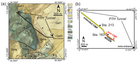 (a) Geologic map, blended with shaded relief, of the study area. Stratigraphic symbols are Qaf1: Young alluvial-fan deposits (Holocene); Qms: Landslide deposits (Holocene and upper Pleistocene); Qaf3: Middle alluvial-fan deposits (middle Pleistocene); Jn: Navajo Sandstone (lower Miocene); TRc: Chinle Formation (Upper Triassic); TRm: Moenkopi Formation (Lower Triassic); Pkt: Kaibab and Toroweap Formations, undivided (upper Permian). Source: [24]. The projection of the PTH Tunnel to the ground surface is shown. (b) An inset map shows the location of the three seismic profiles as coloured lines. The numbers 163 and 213 refer to the locations of the two HVSR soundings discussed in the text.