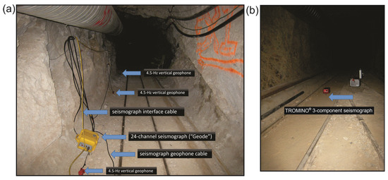 The adit is inclined 2 degrees eastward toward the portal and is mostly straight with minor dog-leg bends (Figure 2). The total length of the tunnel is approximately 2570 m. The section of the tunnel used for seismic surveys is narrow (~3 × 3 m) (Figure 3a,b and Figure 4) and lies 120–510 m below the ground surface, deepening toward the west beneath the east slope of the Tushar Mountains (Figure 1 and Figure 2). For the seismic surveys, we selected the section of the tunnel west of the alluvial talus deposits to ensure the survey line was surrounded by the mineralised host rock (Figure 3). The tunnel invert is underlain by 1–2 m of gravel or crushed country rock with an old narrow-gauge rail installed.