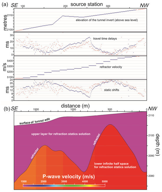 (a) Summary of refraction statics data processing results derived along the extended CMP seismic profile. Red dots represent source static time delays, while blue dots indicate receiver static time delays. (b) Velocity-depth solution obtained from the static delays and refractor velocity for a classic two-layer solution, with the lower layer being an infinite half-space.