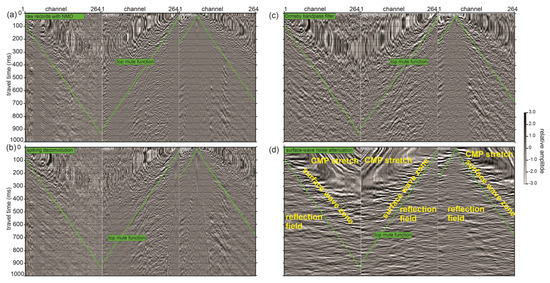 (a) Four non-consecutive common-source records with normal move-out (NMO) applied based on stacking velocity analysis, including a top muting function (to remove direct and head waves), as shown, but without bandpass frequency filtering and spiking deconvolution. (b) The same as above, but with spiking deconvolution applied. (c) The same as above, but with an Ormsby bandpass frequency filter (10–15–130–135 Hz). (d) The same as above, but with surface-wave noise attenuation applied. The reflection fields, surface-wave zones, and areas of CMP stretch are noted.