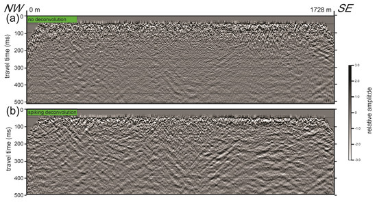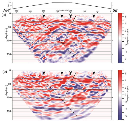 The data processing steps for the short test CMP profile (Figure 2) included the assignment of three-dimensional station geometry, bottom muting of near-source amplitudes to suppress surface-wave energy, Ormsby frequency bandpass filtering (20–35–200–400 Hz, trapezoidal), automatic gain control (AGC) (500-ms operator length), CMP sorting, and CMP stretch mute (attenuation of any sample moved in time by 50% or more) to remove first breaks (direct and head waves). Additionally, normal move-out (NMO) velocity analysis was performed for CMP stacking and for time-to-depth conversion, followed by the stacking of CMP-sorted traces and depth conversion. Parameters for these processes were tested to optimise the potential for shallow targets (e.g., less than 100 m depth). For instance, a range of NMO velocities was used to flatten hyperbolic arrivals, while various corner frequencies were tested for the Ormsby bandpass filter. We started applying a narrower filter by selecting the lower corner frequencies to be 35 and 60 Hz, which reduced the bandwidth and consequently the definition. Expanding the filter by substituting these values with 20 and 35 Hz, respectively, improved the definition of the final image. The application of AGC remained insensitive to operator length, as long as it exceeded the travel time of the deepest target, approximately 100 m. Deconvolution filtering was tested but was found to be destructive. Multiple reflected arrivals were not apparent in the shot records or on the CMP stack section. Post-stack migration was applied to position amplitudes and collapse diffractions accurately. Further details on seismic CMP data processing techniques can be found in [26,27,28].