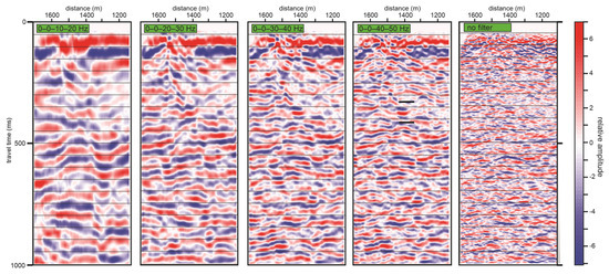Testing bandpass frequency filters on the final part of the brute stack from the extended conventional seismic CMP travel time brute stack, which includes automatic gain control (500-ms window). The optimal composite frequency filter is determined to be 10–15–130–135 Hz.