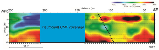 Shear-wave velocity depth model resulting from the modelling of surface-wave dispersion spectra, as shown in Figure 11. The portion of the cross-section without CMP coverage is omitted. The dashed line indicates an interpreted fault or discontinuity.