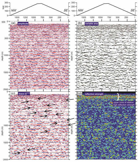 We experimented with reflection strength and trace (i) seismic attributes on the equivalent travel time section to independently characterise the reflectivity on the depth-converted CMP section. Reflection strength responds to variations in lithology and porosity (variations in acoustic impedance) [34,35]. Since we computed this attribute after applying gain balancing, the resulting section depicts relative changes in strength rather than absolute values (i.e., it tracks lateral variability in reflectivity). The trace (i) scalar attribute raises the trace (i) to the power of the scalar (in this case, scalar = 2), while retaining the sign of the input trace sample. This attribute displays only the most coherent events, thereby reducing the possibility of noise interference.