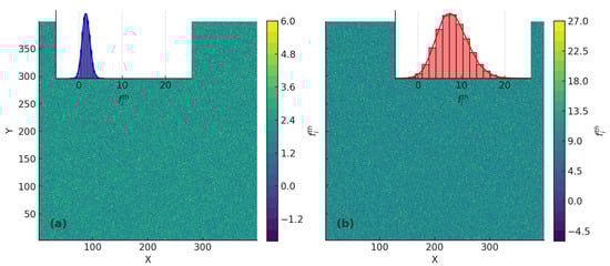 In Figure 1, I present two examples of disorder on the fault, illustrated through contour plots of . At first glance, the two distributions appear visually similar. However, a closer examination of the color bar values reveals that the variance in the left plot (a) is smaller than in the right plot (b), indicating a lower level of heterogeneity in the disorder. To further recognize these differences, the insets display the probability distributions of for both cases. The left inset corresponds to plot (a) and exhibits a narrower distribution, reinforcing the observation of lower variance. Conversely, the right inset, associated with plot (b), shows a broader distribution, confirming the greater variability in disorder.