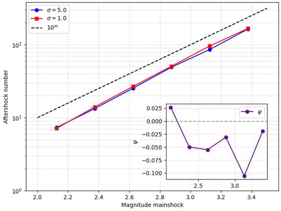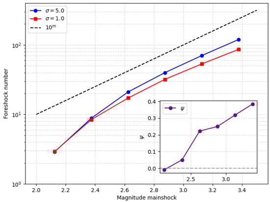 where and are the average number of sequence for the datasets with variances and , respectively. In this case, and . The inset of Figure A1 displays as a function of the mainshock magnitude, confirming that the relative increase in foreshock occurrence due to higher heterogeneity grows with increasing . This trend suggests that the effect of disorder on foreshock activity becomes more pronounced for larger mainshocks, potentially indicating a mechanism where heterogeneity influences the precursory behavior leading up to significant events.
