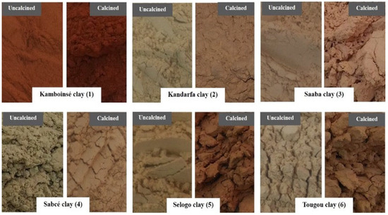 Appearance of uncalcined and calcined clays from different quarries.