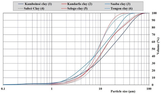 Figure 2 shows the particle size distributions of the six calcined clays based on the laser particle size test. The curves present the cumulative percentages of passing for each clay, which allowed for the evaluation of the diameter of particles corresponding to 50% (d50) and 90% (d90) of the cumulative passing. On average, 50% of the particles in the calcined clays of Tougou, Selogo, and Saaba had diameters less than or equal to 10 μm, whereas the other three calcined clays had 50% of their particles located between 11 and 16 μm. The particle size distribution of a material is a crucial parameter that influences its reactivity: the finer the particles, the higher their reactivity [33].