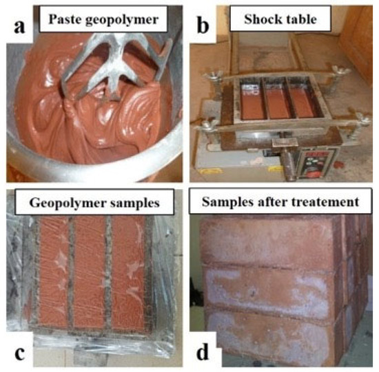 Figure 3. Synthesis protocol of geopolymer samples (a) preparation of geopolymer paste, (b) molding and compaction using a shock table, (c) molded geopolymer samples, and (d) samples after treatment, ready for testing. - Aspect 4: After identifying the most reactive clay, it was used to synthesize a geopolymer binder. Prismatic samples (4 × 4 × 16 cm3) were prepared and subjected to a 14-day curing process: 7 days at ambient laboratory temperature, followed by 7 days of heat treatment in an oven at 30, 60, and 90 °C.