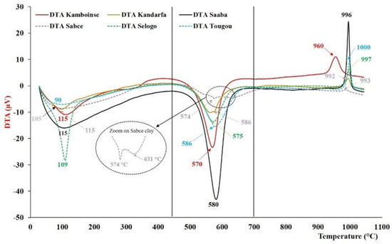 The six types of uncalcined clay, characterized by thermogravimetric analysis (TGA) and differential thermal analysis (DTA), are presented in Figure 4 and Figure 5. They were similar, with some divergences around the clay type. Generally, these thermograms revealed the presence of three common peaks: two endothermic peaks and one exothermic peak. The first endothermic peak, between 90 and 115 °C, was attributed to the loss of mass linked to the departure of hygroscopic water initially present in the clay. The second endothermic peak, between 563 and 586 °C, was related to the dehydroxylation of kaolinite and its transformation into metakaolinite. According to the literature, dehydroxylation temperatures range between 530 and 700 °C [32]. The relative mass losses observed between 450 and 700 °C are listed in Table 4 and varied from 11.6% (Saaba) to 3.36% (Sabcé). These values were lower than those expected for pure kaolinite (13.95%) [39], indicating the presence of other associated minerals. It is noteworthy that the double peak around 574 and around 631 °C, which showed the presence of minerals other than kaolinite in the Sabcé clay (4), has yet to be identified by XRD. Finally, the last common exothermic peak between 960 and 1000 °C was linked to the structural reorganization of metakaolinite into mullite [40].