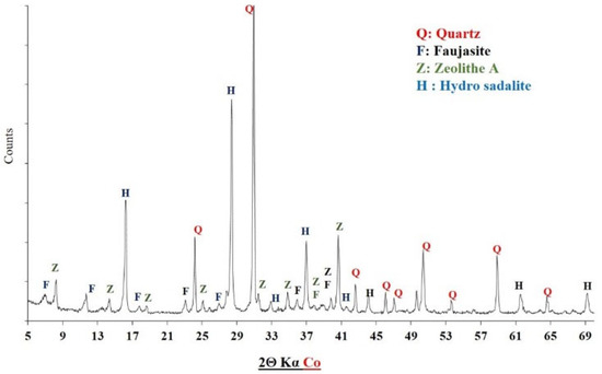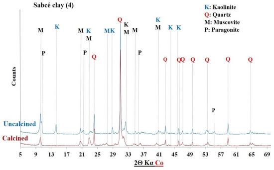 It is accepted that the most reactive clays in an alkaline environment contain more metakaolinite after calcination at approximately 700 °C [29,32]. The endothermic peaks around 563–586 °C, related to the dehydroxylation of kaolinite, occurred below 700 °C, confirming the total transformation of kaolinite into metakaolinite in the different clays.
