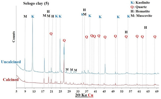 The diffractograms of the uncalcined clays indicated the presence of common crystalline minerals including kaolinite (Al2Si2O5(OH)4) and quartz (SiO2). The raw clay from Saaba (3) contained only crystalline minerals. However, additional crystalline phases were detected depending on the sample’s origin, distinguishing each clay: hematite (Fe2O3) in the Kandarfa, Selogo, and Tougou samples; muscovite (KAl2(AlSi3O10)(OH, F)2) in the Kandarfa, Sabcé, Selogo, and Tougou samples; and paragonite (NaAl2(AlSi3O10)(OH)2) in the Sabcé and Kandarfa samples.