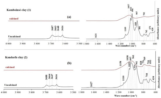 FTIR of the uncalcined and calcined clays of Kamboinsé (a) and Kandarfa (b).