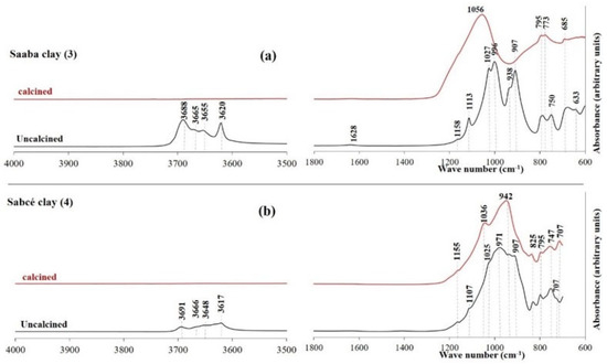 FTIR of the uncalcined and calcined clays of Saaba (a) and Sabcé (b).