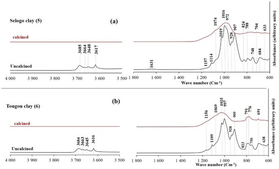 FTIR of the uncalcined and calcined clays of Selogo (a) and Tougou (b).