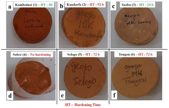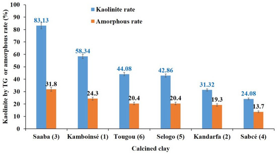 However, the divergence of these thermal curves resides in certain endothermic peaks located around 300 °C (Kamboinsé, Kandarfa, and Selogo clay) and 705 °C (Kandarfa clay), which could respectively be attributed to the transformation of goethite into hematite and the dehydroxylation of paragonite [41]. The endothermic peak around 576 °C reflects the transformation of α-quartz into β-quartz [42]. The mass loss corresponding to the thermal incident between 450 and 700 °C made it possible to estimate the kaolinite composition, and the results are presented in Table 4. The clays of Saaba (3), Kamboinsé (1), Tougou (6), and Selogo (5) respectively had the highest contents of kaolinite of 83.1, 58.3, 44.1 and 42.9, and are supposedly more reactive than Kandarfa (2) and Sabcé (4), which contain low amounts of kaolinite (31.3 and 24.1%, respectively). Although the Kandarfa and Selogo clays originated from the same region, they displayed differences in both their physical and thermal properties.