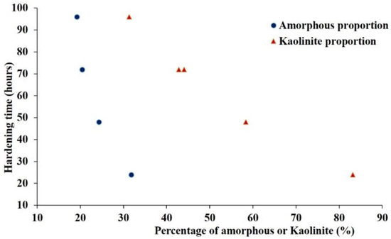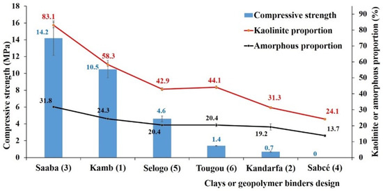 Although metakaolin-based geopolymers exhibit high mechanical strength (40–50 MPa) and low porosity [28], their performance depends on several physicochemical and mineralogical factors such as the particle size, specific surface area, amorphous silica and alumina content as well as the morphology of the precursors [29]. Additional studies [13,30] have revealed the significant influence of the mineralogical and chemical composition of aluminosilicates, particularly their degree of amorphousness.