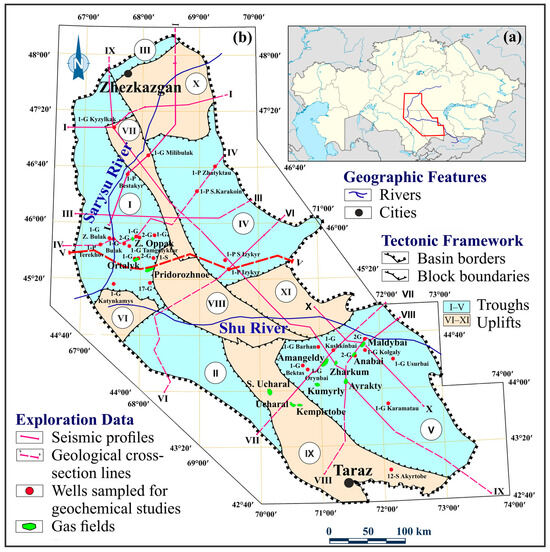 Location of the (a) Shu-Sarysu Basin (SSB) within Kazakhstan; (b) tectonic structure and exploration framework of the basin (modified after [1]). Geographic features: red frame (panel a)—location of the Shu-Sarysu Basin within Kazakhstan; blue solid lines—rivers; black circles—cities. Tectonic framework: black solid lines with square barbs—basin borders; black solid lines with barbs—tectonic block boundaries; light blue fill—troughs: I—Kokpansor Trough; II—Sozak-Baikadam Trough; III—Zhezkazgan Trough; IV—Tasbulak Trough; V—Moiynkum Trough; light brown fill—Uplifts: VI—Bugudzhil Uplift; VII—Betpakdala Uplift; VIII—Tasty Uplift; IX—Talas Uplift; X—Sarysu Uplift; XI—Lower Shu Uplift; exploration data: red solid lines—seismic profiles; red dashed lines—geological cross-section lines; red circles—wells sampled for geochemical studies; green polygons—gas fields.