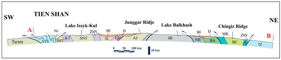Simplified geotectonic map of the (a) Central Asian Orogenic Belt; and (b) Kazakhstan Orocline (modified after [29]). Microcontinents with PR1 basement and PR2 to PZ1 cover: IMT—Ishim–Middle Tien Shan; SNT—Stepnyak–North Tien Shan; SI—Shu-Ili; AJ—Aktau-Junggar; Tarim—Tarim. Volcanic arcs: Se—Selety (Cm); BC—Bozshekul-Chingiz (Cm2-S1); BA—Baidaulet-Akbastau (O); ZhS—Zharma-Saur (D-C); B—North Tien Shan-Bogdo Shan (D-C); Va—Valerianov (C1-2). Accretionary wedges and suture zones: KK—Kumdykol (Cm); ZhN—Zhalair-Naiman (Cm3-O1); KT—Kyrgyz-Terskey (Cm3-O1); U—Urumbai (Cm3-O1); MK—Maikain-Kyzyltas (Cm2-S1); EI—Erementau-Ili (O2-3); A—Arkalyk (Pz1); ZS—Zhaman-Sarysu (O-D3); NB—North Balkhash (O-D3); KM—Karamai (O-D3); JB—Junggar-Balkhash (D3-C). Active continental margin arcs: VV—Kokchetav-North Tien Shan (O2-3); D—Devonian arc (D1-2); T—Turgay arc; BI—Balkhash-Ili (C2-P); CK—Chatkal-Kurama (C1-P). Sedimentary basins: light pink fill—passive margin (D2-C2): Tg—Turgay; Kt—Karatau; Nr—Naryn; yellow fill—epicontinental marine basins (D3-C2); light yellow fill—non-marine basins (D3-P): Tn—Teniz; SS—Shu-Sarysu; light blue fill—accretionary and collisional belts (PZ3): Ural—Ural; IZ—Irtysh-Zaisan; STS—South Tien Shan. Terrane boundaries: solid black line—definite; dashed line—inferred in subsurface; blue dashed line—trace of suture inferred in subsurface; black triangle line—inferred direction of subduction; white fill—MZ-CZ; pink dashed line—international border; solid red line—A/B section line.