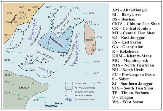 Palinspastic map showing the tectonic configuration of the Central Asian Orogenic Belt during the Early Devonian, 390 Ma (modified after [29]). AM—Altai-Mongol; BL—Barlyk Arc; BS—Beishan; ChTS—Chinese Tien Shan; CK—Central Kunlun; MT—Central Tien Shan; EJ—East Junggar; ES—East Sayan; GA—Gorny Altai; K—Kokchetav; KHM—Khanty-Mansi; MG—Magnitogorsk; NTS—North Tien Shan; NU—North Urals; PC—Pre-Caspian Basin; S—Salym; SJ—Southern Junggar; STS—South Tien Shan; TP—Timan-Pechora; U—Ubagan; WS—West Sayan; VV—Island arc; ××—Active margin arc; Sawtooth line—Subduction zone; Wavy line—Passive margin; Double-bar line—Ridge-transform boundary.
