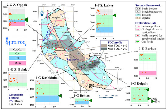 Shu-Sarysu Basin is a composite intracontinental basin located at the junction of cratonic and orogenic domains of southern Kazakhstan. It comprises a thick Paleozoic succession including carbonate–clastic reservoirs, regional seals, and source rocks, distributed across multiple structural troughs and uplifts. Early concepts of hydrocarbon (HC) potential in the SSB emerged in the 1920s-1930s from works by Soviet geologists including Arkhangelsky, Kassin, and Satpayev [2,3,4]. Systematic exploration began in 1954, employing gravimetric, aeromagnetic, satellite, and seismic methods, including early common depth point profiling and later high-resolution 2D surveys [5,6,7,8,9,10,11,12,13,14,15,16,17]. In 1962, industrial gas inflow was recorded at the Ucharal structure (23-G), confirming prospectivity of Paleozoic succession [14]. Twelve gas fields were discovered across Talas Uplift, Moiynkum, and Kokpansor troughs. The largest accumulation, Amangeldy (884 Bcf), is primarily hosted in Late Devonian–Early Carboniferous carbonates and Early Permian clastics. Pridorozhnoye, with estimated reserves of 225 Bcf, is another major field, with hydrocarbons trapped in terrigenous sub-salt deposits of the upper Famennian (Late Devonian) and in carbonates of the upper Visean (Early Carboniferous). Several fields also contain gas condensate [18]. Alongside drilling efforts, geochemical investigations in the 1960s–1970s focused on the Moiynkum Trough, applying luminescence-bitumen analysis and total organic carbon (TOC) measurements to assess source rock potential of Late Devonian to Carboniferous strata.