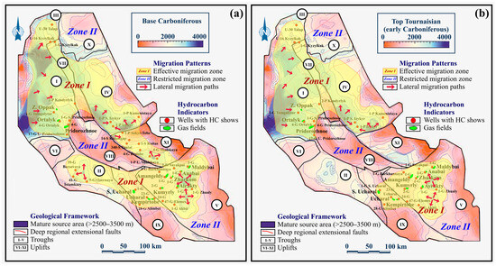 Spatial patterns of source rock maturity, inferred migration pathways, and geological success probability zones within (a) Late Devonian and (b) Early Carboniferous intervals of the Shu-Sarysu Basin (modified after [14,28,45,97,98,99,100,101,102,103,104,105,106,107,108,109]). Migration patterns: Zone I (yellow transparent fill)—effective migration and accumulation; Zone II—restricted migration; yellow arrows—lateral migration paths; hydrocarbon indicators: red circles—wells with hydrocarbons (HC) shows; green polygons—gas fields; geological framework: blue fill—potentially mature source area (>2500–3500 m); solid red lines—deep regional extensional faults; I–XI—troughs and uplifts as in Figure 1. Interpretive note: Zones I and II correspond to areas of relatively high and reduced geological success probability, respectively, based on petroleum system element functionality and structural configuration.