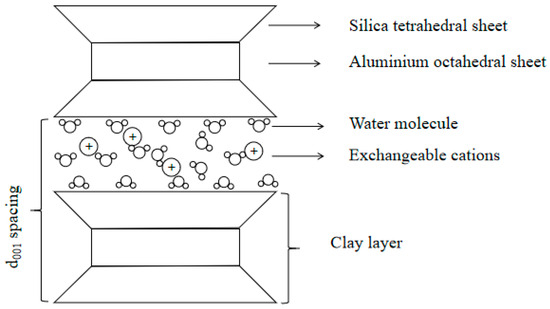 Temperature also exerts a substantial effect on the d001 spacing of the clay platelets. Clay platelets incorporating 0 to 4 layers of interlayer water molecules can be identified by characteristic d001 spacings of approximately 10.0, 12.5, 15.0, 17.5, and 20.0 Å, respectively [30]. The thickness of interlamellar hydrates depends on the hydration ions in montmorillonite clay; for example, for Na+ ions, the first layer hydrate is 3.03 Å, second layer hydrate is 3.23 Å, and third hydrate is 3.48 Å; while for Ca2+ ions, the first and second layer hydrate is 3.89 and 2.75 Å, respectively [12]. The bentonite treated at a very high temperature can decrease the d001 spacing from 20 Å to 10 Å.