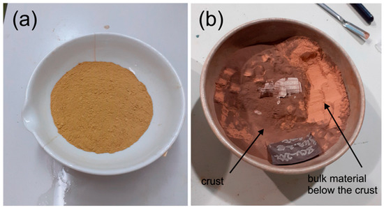 Comparison of the original (a) and thermal-treated (b) BCV 2017 at 200 °C. Note the presence of a thin dark crust on the surface of the thermally treated material (Laufek et al., 2021) [11].