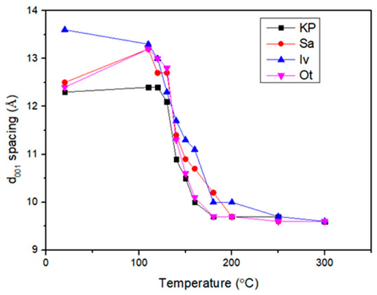 The d001 spacing changes were replotted with heat treatment at different temperatures for four bentonites (from Hrobáriková et al., 2001) [31].