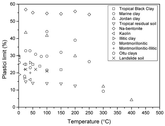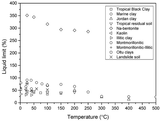 Numerous studies have investigated the effect of temperature on the Atterberg limits of clay, as it is quite important in engineering applications. In this review paper, various clay types from different regions worldwide were selected to fully understand the temperature effects on the Atterberg limits. Table 1 lists the clays studied in this section. The studied clays are as follows: tropical black clay from Nigeria heating for 4 h reported by Gadzama et al. [39]; marine clay from India heated for 7 days reported by Nayak and Preetham [40]; Jordan clay reported by Abu-Zreig et al. [41]; tropical residual soil from Nigeria heated for 6 h reported by Attah and Etim [42]; commercially available Na-bentonite heated for 3 days reported by Estabragh et al. [15]; Olut clays from Turkey heated for 24 h reported by Tan et al. [43]; Kaolin, Illitic clay, Montmorillonitic, Montmorillonitic-Illitic clays from US heated for 3 h reported by Laguros JG [44]. All of these clays were heated at different temperatures from room temperature (20–25 °C) to 500 °C. The temperature used here means that the clay was heated at this temperature. However, it is quite hard to get the unified heating duration for all the clays; the detailed heating duration is listed in Table 1. It can be seen that the liquid limit varied from 32% to 349%, and the plastic limit varied from 15% to 55% for all the clays. The details of the clay information can be obtained from the reference list.
