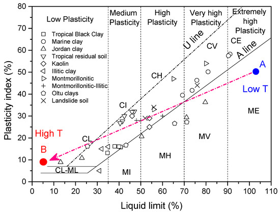 Figure 5 and Figure 6 show the plastic limit and liquid limit changes with the temperature of all clays. In general, it can be seen that both decreased with the increase in temperature. However, the decrease trend is different from the others. The type of clay was classified by the plasticity chart; the initial clay type of each clay can be obtained in the upper right corner of the map in Figure 7. As observed, some clays changed their state during heating temperature (from lower temperature region point A to higher temperature region point B) in Figure 7. For example, the Jordan clay is classified as MV at room temperature; it is reclassified as CL after heating at 400 degrees. This almost happened to each kind of clay; they are almost transferred from higher plasticity zones to lower plasticity zones. The temperature significantly decreases the plasticity of clays and transfers the clays to lower or non-plasticity clays.