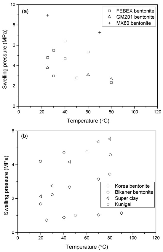 Swelling pressure is a function of temperature. The value of swelling pressure depends on the content of montmorillonite [53]. The swelling pressure also depends on the type of dominant cation it possesses, i.e., sodium or calcium. The increase in temperature can decrease the swelling pressure, as shown in Figure 8a for FEBEX bentonite, GMZ01 bentonite and MX80 bentonite, or increase the swelling pressure, as shown in Figure 8b for Kyungju bentonite, Bikaner bentonite, super clay, and Kunigel bentonite.