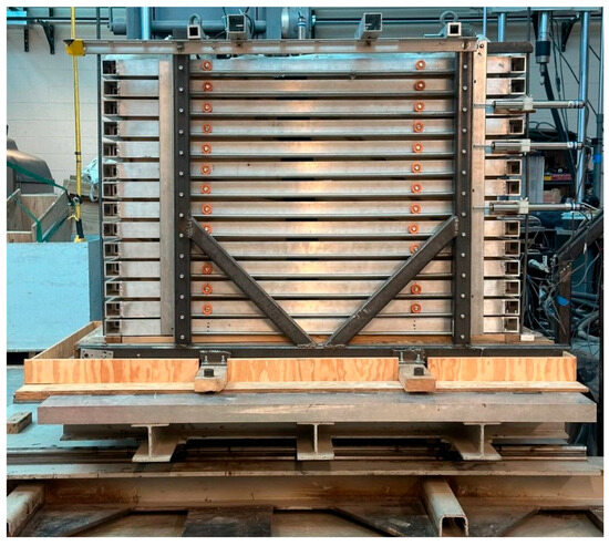 This study was conducted using a 1 g shaking table facility at Southern Illinois University. The shaking table was equipped with a hydraulic actuator capable of generating unidirectional stroke displacements of up to 25 cm (ranging from −12.5 cm to +12.5 cm), with a maximum load capacity of 150 kN [32]. Sample preparation was carried out in a laminar box measuring 1.22 m in length, 0.51 m in width, and 0.91 m in height. The box consisted of fourteen horizontally arranged rectangular hollow aluminum tubes, which allowed for relative movement through a roller-based system (Figure 1).