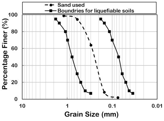 Grading curve of sand used in this research and boundaries for liquefiable soils [34].