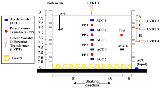 The sand used in this study (Figure 2) is classified as poorly graded sand (SP) based on the Unified Soil Classification System (USCS), with properties of D10 = 0.16 mm, D50 = 0.25 mm, and GS = 2.66. A sandy specimen with a thickness of 75 cm was prepared at an approximate relative density of 30% using a sand raining technique. Various transducers, as illustrated in Figure 3, were employed in the model test to record acceleration (ACC1–ACC6), pore water pressure (PP1–PP5), settlement (LVDT1), and horizontal displacement (LVDT2–LVDT4) at different depths. To contain the sand sample, a geomembrane bag was employed. The bottom of the laminar box was covered with an 80 mm thick layer of compacted clean gravel to ensure uniform water penetration during saturation. After sample preparation, CO2 was introduced to replace trapped air in the pores, enhancing the final saturation level of the sample. Water was then slowly released from the bottom of the sample through the gravel layer at a controlled rate, following procedures outlined in previous research [26,33].
