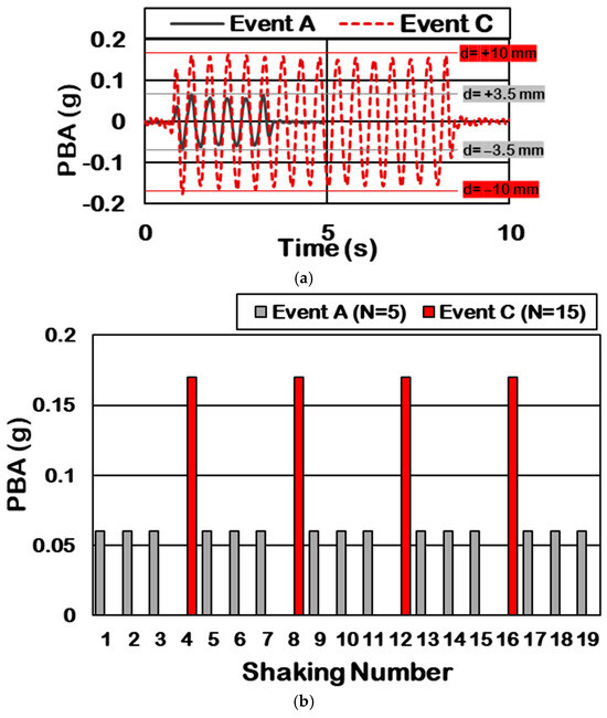 The experiment involved subjecting the sample to two distinct seismic events, each with a frequency of 2 Hz, applied in a specific sequence. The effect of loading frequency on liquefaction resistance is a controversial topic. Due to discrepancies in research findings regarding frequency effects, this study selected a loading frequency based on previous earthquake records that are widely used in liquefaction studies. A one-dimensional (1D) sinusoidal wave served as the input motion. As the main earthquakes usually include weaker foreshocks and aftershocks, this study applied 3 small shakings before and after the main event. These events were repeated to investigate the effect of all previous shakings and an increase in soil relative density. Event A, as small shakings, had a peak base acceleration (PBA) of about 0.06 g (d = ±3.5 mm) with 5 full cycles, respectively. Event C, as a large shaking, featured a PBA of about 0.17 g (d = ±10 mm) with 15 full cycles. A 5-cycle event (Event A) represented an earthquake with a magnitude of approximately 6, while a 15-cycle event (Event C) corresponded with an earthquake with a magnitude of about 7.5 [8]. Enough silent time intervals were utilized between shakings (S) to allow for the complete dissipation of excess pore water pressure (EPWP) produced during the tests. Regarding the sequence of events, Event A was applied during S1–S3, S5–S7, S9–S11, S13–S15, and S17–S19, while S4, S8, S12, and S16 were designated as Event C (see Figure 4).