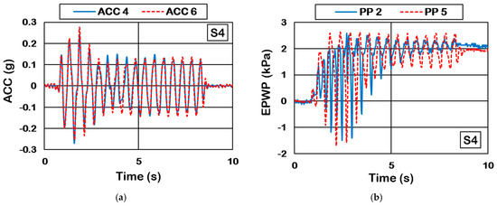The boundary conditions of the laminar box fixed on a shake table involve the constraints or limitations applied to the edges or surfaces of the box during testing. These conditions are essential in influencing the soil behavior within the box during seismic simulations. To reduce these effects, the rectangular hollow horizontal tubes were designed to move freely on each other via rollers. A flexible geomembrane bag was utilized to contain the soil sample. To monitor the possible effect of boundary conditions on the experimental results, ACC6 and PP5 were located at a 15 cm distance from the laminar box side. Thus, the time history of acceleration (ACC4 versus ACC6) and excess pore water pressure (PP2 versus PP5) at depths of 52.5 and 30 cm from the ground surface were compared during Shaking 4 (S4) in Figure 5 as an example. The other large shakings (i.e., S8 and S12) also showed similar observations. There was a reasonable match between acceleration and the EPWP results recorded at the center and the edge of the laminar box, particularly for the purpose of determining PGA (or the amplification factor) and the maximum EPWP (or Ru). This indicates that the induced boundary effects were limited. The following sections discuss the results of accelerometers and pore water pressure transducers located at the center of the sample to prevent any possible boundary effects. Additionally, an effort was undertaken to mitigate the impact by band-filtering the data (raw acceleration data) to eliminate certain inaccuracies [35].