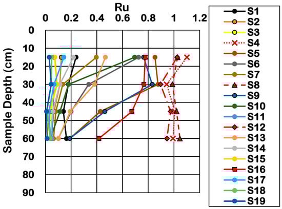The generation and dissipation of EPWP are critical in evaluating seismic behavior in saturated soils. Pore water pressure transducers were located at depths of 15, 30, 45, and 60 cm below ground level. To assess “liquefaction triggering”, indicating a state where the ratio of pore pressure approaches 1 (Ru ≈ 1), the ratio of EPWP to the initial vertical effective stress (Ru = Δu/ơ′v) was evaluated. The computation of Ru could potentially be influenced by variances between the intended and actual elevations, a discrepancy that could arise from the movement of embedded pore water pressure transducers during shakings. Despite this potential source of error, this study proceeded to use the prescribed elevations with the absence of a reliable methodology for the exact determination of in situ elevations in line with other literature studies [23,25,36]. Figure 6 demonstrates the Ru measured at four depths in the sample throughout 19 shakings. During Event C at S4, S8, and S12, liquefaction happened at all depths. In subsequent Event A (S5, S9, and S13) after liquefaction, higher Ru values were measured at shallow depths compared with deeper depths. The primary reason for this phenomenon was the upward flow of water through the sample during liquefaction, which disrupted the soil structure and formed localized weak zones at shallow depths, thereby increasing their susceptibility to re-liquefaction during subsequent loading events [37].