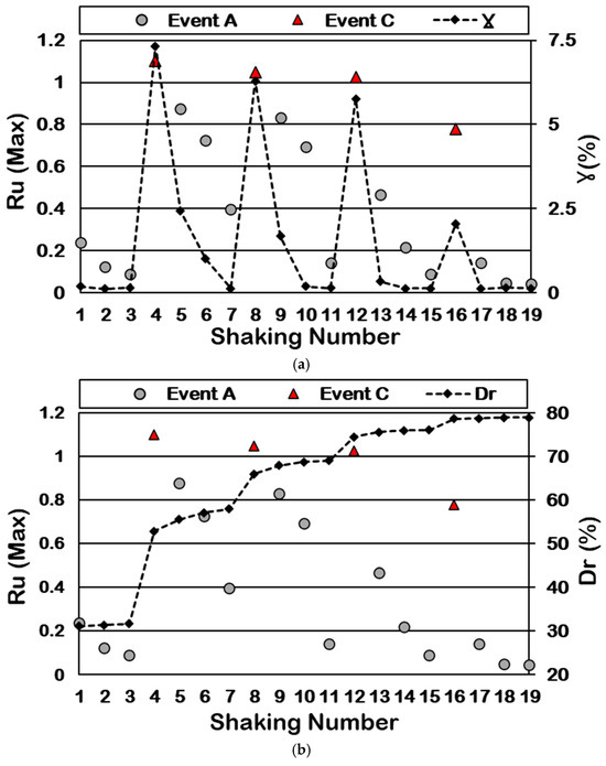 In some cases, liquefaction may happen for lower values of Ru due to strong input motions causing extensive strains [38]. Thus, the shear strain caused during shakings at the location of pore water pressure transducers was calculated to confirm the liquefaction occurrence [31]. Figure 7a shows the Ru at the peak EPWP and maximum shear strain calculated in the sample for each shaking. The Ru results indicate that liquefaction occurred during Event C at S4, S8, and S12. This observation was corroborated by the shear strain measurements, which exceeded the threshold of 3.75% single amplitude, confirming the occurrence of liquefaction. Moreover, the variation in the average relative density at the end of each shaking was calculated through surface settlements, as shown in Figure 7b [21,26].