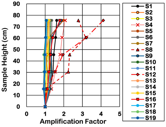 As indicated in Figure 3 and Figure 5, accelerometers were used to record the acceleration time history induced during each shaking at depths of 7.5, 22.5, 37.5, 52.5, and 67.5 cm, and another one (ACC: Input) was located on the shake table to measure the input motion. The amplification factor was calculated as the ratio of the recorded acceleration at various depths to the input motion. Figure 9 displays the amplification factor at various depths in the sample during 19 shakings. The results for all events indicate a progressive growth of acceleration amplitude from the bottom to the surface of the sample. This trend aligns with historical earthquake reports and experimental research, where seismic waves tend to amplify as they approach the ground surface [24,43]. It was observed that acceleration amplified in the sample during large shakings until liquefaction happened. After liquefaction, the sample behaved like liquid and the acceleration amplitude decreased (see Figure 5a). The amplification factor before liquefaction occurrence for large shakings (Event C) was considerably higher compared with small shakings (Event A). Similar observations have been reported that as shaking intensity increases, the amplification factor increases [24,44]. Castiglia et al. [44] revealed that as the acceleration amplitude increases, the instantaneous frequencies of some layers approach the natural frequency of the soil, which leads to higher amplification. This phenomenon, referred to as soil resonance, is linked to the production of significant pore water pressure. The findings of this study confirm that larger shakings, which induce higher EPWP, are associated with greater amplification factors.
