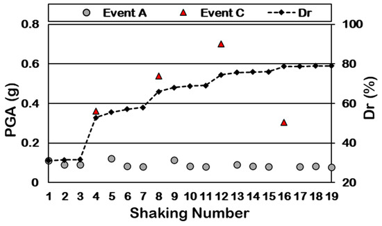 Figure 10 indicates the peak ground acceleration (PGA) recorded at shallow depths throughout 19 shakings. The measured PGAs during small shakings (Event A) were between 0.08 and 0.12 g, while this value was about 0.36, 0.54, 0.7, and 0.31 g for Event C at S4, S8, S12, and S16, respectively. It can be observed that the PGA trend changes as the sample becomes denser (Dr > 76%) and Ru decreases. The wave propagation is higher at S12 compared with S4 and S8 because the number of cycles required for the liquefaction of densified samples increases. In contrast, further increases in relative density in S16 result in a lower Ru and reduced wave propagation. Previous studies concluded that the PGA increases as relative density increases [45]. However, the findings of this study indicate that the PGA is influenced by the EPWP generated, rather than by relative density. Similarly, a comparison among small shakings (Event A) revealed that the PGA recorded did not directly change with the relative density. As the Ru generated during S5 and S9 was higher, the PGA recorded in the sample was higher compared with other small shakings (Event A).