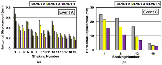 The relative horizontal displacement of soil refers to the horizontal movement of the soil profile during each shaking. Figure 11 illustrates the maximum relative horizontal displacement recorded during small shakings (Event A) (Figure 11a) and large shakings (Event C) (Figure 11b) at depths of 8, 20, and 39 cm from the ground surface. It can be observed that the horizontal displacement increases from the bottom to the top of the sample due to a higher amplification factor at shallow depths. According to Figure 11a, as the number of small shakings (Events A) increases, the horizontal displacement decreases. Despite a less than 1% increase in relative density, the average reduction in horizontal displacement from S1 to S3 was about 40%. A similar reduction trend in horizontal displacement was noted from S5 to S7, S9 to S11, S13 to S15, and S17 to S19. Small shakings cause a slight increase in relative density, which mainly contributes to the improvement in interlocking among soil particles. In contrast, large shakings increase the horizontal displacement of soil in subsequent shakings despite a noticeable increase in soil relative density. Although considerable densification happened during liquefaction (S4, S8, and S12), subsequent Event A (S5, S9, and S13) measurements showed higher horizontal displacement compared with previous Event A measurements. This tendency is mainly linked to soil-structure disturbance due to the upward flow of water during large shakings. Thus, interlocking among soil particles plays a more significant role in horizontal displacement behavior compared with densification. According to Figure 11b, a corresponding decrease in horizontal displacement is observed as the number of large shakings (Event C) increases. Although the relative density of the sample increased from 31% to 69% throughout S4 to S12 (including three liquefaction events), the average horizontal displacement reduction was about 49%.