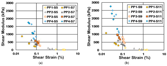 To investigate the impact of small shakings on soil dynamic behavior, the shear modulus for Event A was analyzed. Figure 13 presents a comparison of the shear modulus between S5 and S7 as well as S9 and S11 as representative examples. It indicates that small shakings improve soil stiffness and decrease the shear strain caused in the soil. The finding highlights that small shakings can mitigate the liquefaction potential by enhancing the shear modulus in susceptible soils.