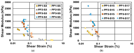 The shear modulus curve is typically represented by plotting the shear modulus (G) against shear strain (γ) based on laboratory cyclic loading test results in soil dynamic studies. Consequently, the shear modulus is typically normalized by the maximum shear modulus (G0) at γ = 0.0001%. However, as shaking table tests produce higher shear strains, the shear modulus is normalized by the shear modulus (G) at γ = 0.01% [36]. Thus, the results of this study are presented in the form of . As the shear strains induced in small shakings were close to 0.01%, the shear modulus () at each depth was determined using the best-fit trendline (Figure 16).