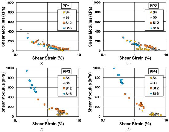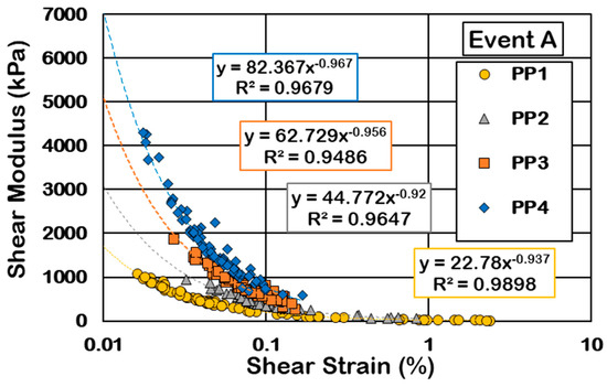 Comparison of shear modulus and shear strain caused during Event C at the location of (a) PP1, (b) PP2, (c) PP3, and (d) PP4.
