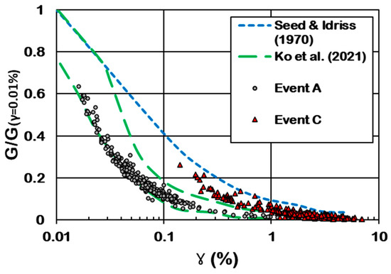 After determining the shear modulus at γ = 0.01%, the shear modulus calculated for each cycle during Event A and C throughout 19 shakings was normalized. Figure 17 compares the normalized shear modulus curves from this research with those from the shaking table tests conducted on loose- to medium-density sand [36]. It also compares the results with the model suggested by Seed and Idriss [48], which is derived from small-scale dynamic experiments on virgin clean sand under higher confining pressure and has become a widely referenced model. There is a reasonable match between the results of this study and those obtained by Ko et al. [36]. As shaking table tests are conducted under low overburden pressure, the shear strain increase with EPWP generation is higher compared with other dynamic tests. As a result, the shear modulus degradation curves derived from the shaking table experiments exhibit lower values compared with those presented by Seed and Idriss [48]. The upper and lower boundaries of the results of Ko et al. [36] for virgin samples were generally obtained from higher and lower overburden pressures (depths), respectively. Given that the present study was conducted under even lower overburden conditions, the results for Event A, which influenced the soil within the elastic range, align more closely with the lower boundary of Ko et al. [36]. However, pre-shaking improved soil stiffness during Event C, especially at deeper depths. As a result, the observed results for large shakings exceeded the upper boundary of Ko et al. [36], which was based on tests conducted on virgin sand.